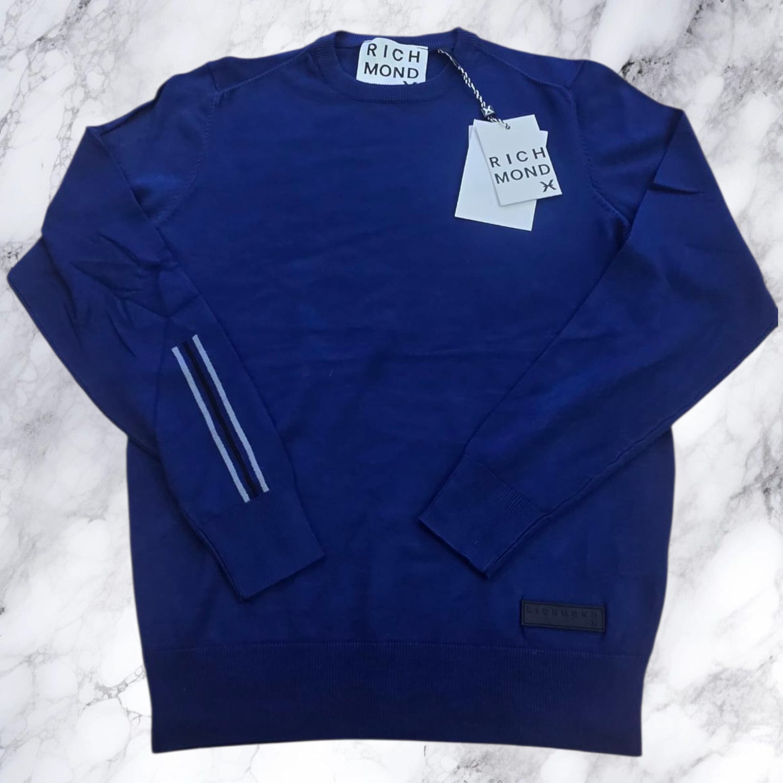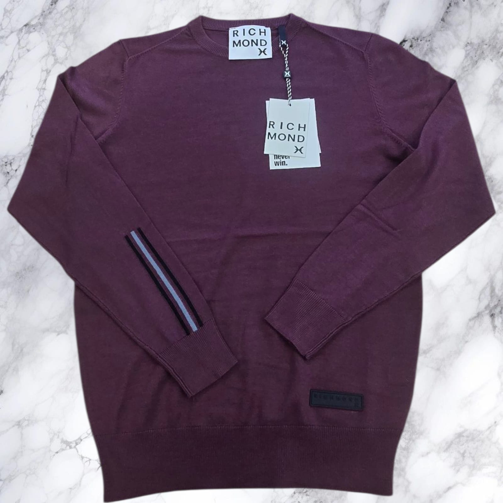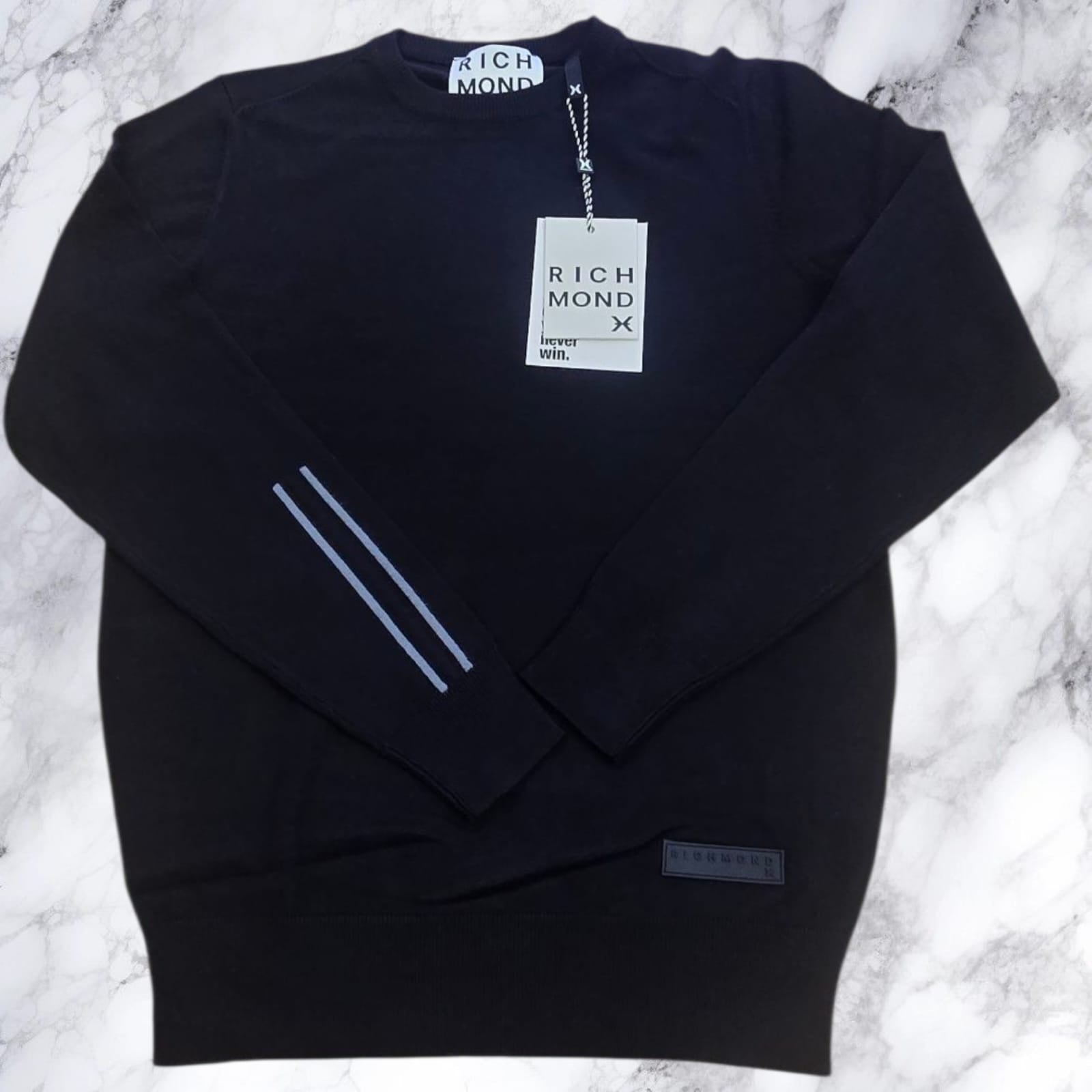John Richmond maglia girocollo a manica lunga in misto viscosa, modello dal design essenziale e moderno. La patch logo applicata sul fondo e le 3 strisce sul retro della manica rendono il capo unico e distintivo. Perfetta da indossare con jeans o pantaloni casual, è una scelta versatile e raffinata per ogni occasione.